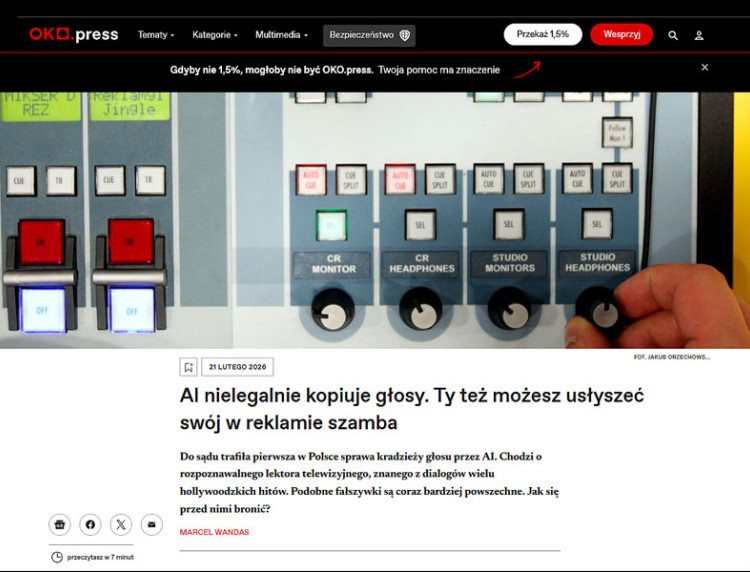 [...] „Teoretycznie nie mamy do czynienia z głosem lektora, jest to jego syntetyczna wersja, natomiast faktycznie słyszymy jego głos. Technologia komplikuje sprawę i nadaje jej wyjątkowości. Według naszej wiedzy w Polsce nie było wcześniej takiego przypadku, zwykle sprawy dotyczyły materiałów deepfake wykorzystujących wizerunek raczej niż głos, w tym np. treści pornograficznych” – mówi w rozmowie z OKO.press Wiktoria Stasiewicz, prawniczka reprezentująca Łukomskiego.