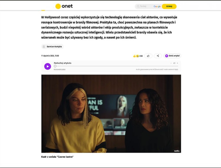 Brytyjscy aktorzy coraz głośniej sprzeciwiają się cyfrowemu skanowaniu ciał na planach filmowych i telewizyjnych. Pod koniec zeszłego roku, w przełomowym głosowaniu członkowie związku zawodowego Equity niemal jednogłośnie opowiedzieli się za odmową udziału w takich praktykach, domagając się lepszych zabezpieczeń dotyczących sztucznej inteligencji. Wynik głosowania ma być silnym argumentem w negocjacjach z producentami. [...]