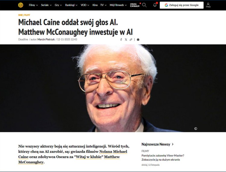 Tytuł: Michael Caine oddał swój głos AI. Matthew McConaughey inwestuje w AI