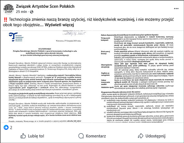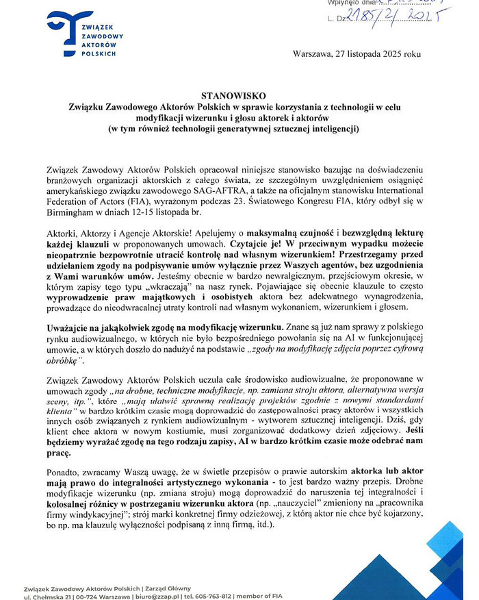 - Technologia zmienia naszą branżę szybciej, niż kiedykolwiek wcześniej, i nie możemy przejść obok tego obojętnie. [...] To temat, który dotyczy każdego artysty wykonawcy - stwierdza Związek Artystów Scen Polskich