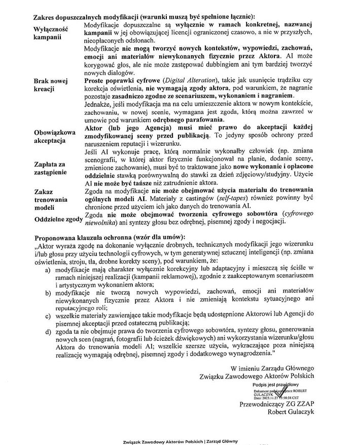 - AI potrafi już nie tylko „poprawić scenę”, ale też stworzyć zupełnie nową - bez udziału aktora. Zgoda na „drobne modyfikacje techniczne” może brzmieć niewinnie, ale w praktyce prowadzi do realnej utraty kontroli nad własną twarzą, głosem i wykonaniem.