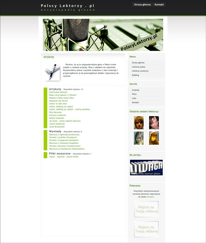 Z biegiem lat pojawiło się również wiele nowych działów. Poza poświęconej zawodowcom bazie encyklopedycznej "Sylwetki lektorów" ogromnym powodzeniem cieszy się stworzona z myślą o amatorach "Próba mikrofonu". Od informacji pęcznieje dział "Kto to mówi" - dzięki jego rosnącym zasobom można z łatwością skojarzyć usłyszaną produkcję z konkretnym nazwiskiem.