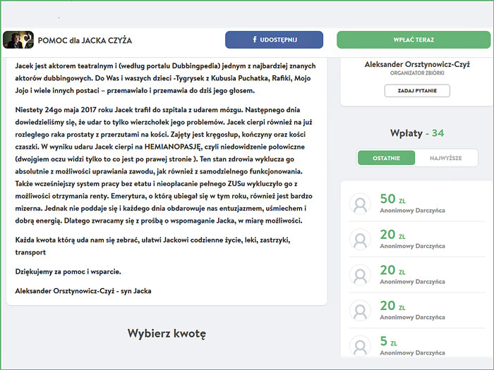 "Trudno znaleźć sposób, żeby wyrazić wdzięczność wobec wszystkich Państwa którzy przyczyniliście się do rozmiaru, wymiaru i powszechności w mediach zarówno klasycznych jak i społecznościowych - tej zbiórki. Zebrane pieniądze pozwolą na to, żeby każdy dzień z życia Jacka był łatwiejszy. Nie sposób wymienić wszystkich ułatwień jakie dają datki zebrane w zbiórce, od najprostszych codziennych spraw zakupów czy transportu dla osoby w tym stanie zdrowia po możliwość korzystania z wszelakich badań dotyczących zarówno kwestii zmian po-udarowych, jak i niestety szybko postępującego przerzutu nowotworu. Mówi się, że nie da się kupić sobie czasu; otóż da się i w tym przypadku to właśnie Państwa zasługa! Z wyrazami szacunku i ogromnym podziękowaniem w imieniu Jacka Czyża - Aleksander Orsztynowicz-Czyż".