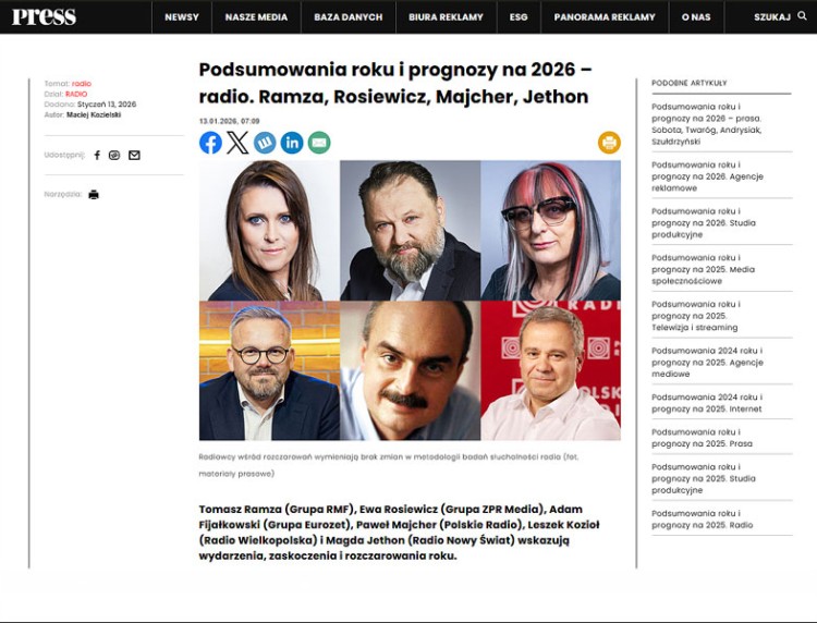Najważniejszym wydarzeniem minionego roku dla naszej Grupy były bardzo dobre wyniki słuchalności Radia Zet, które w 2025 roku osiągnęły najwyższy poziom od ponad 11 lat. Jest to efekt konsekwentnie realizowanej strategii programowej redaktora naczelnego stacji i dyrektora programowego Mariusza Smolarka. Dzięki jego wyczuciu radia i umiejętności prowadzenia zespołu, w ciągu ostatnich lat udało się nam odbudować to, co wcześniej straciliśmy – zaufanie słuchaczy i stabilną pozycję anteny. Głęboko wierzę, że przy tak zaangażowanym zespole oraz spójnym zarządzaniu przywrócimy Radiu Zet jego wielkość.