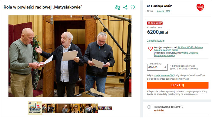 Na apel WOŚP odpowiedziała radiowa Jedynka. W opisie aukcji na Allegro czytamy: "Teatr Polskiego Radia zgłasza odegranie roli epizodycznej w kultowej powieści radiowej MATYSIAKOWIE.