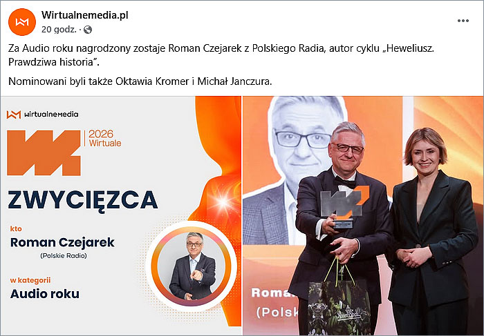 Wśród nagrodzonych projektów, realizowanych w 2025 roku, znalazła się produkcja Romana Czejarka "Heweliusz. Prawdziwa historia".