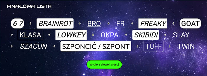 15 słów i zwrotów dostało się do finału plebiscytu organizowanego przez Wydawnictwo PWN. Znalazły się w nim m.in. "6 7", "klasa", "szponcić/szpont", "lowkey", "skibidi" i "tuff". Rok temu tryumfowała "sigma" - przypominają Wirtualnemedia.pl.