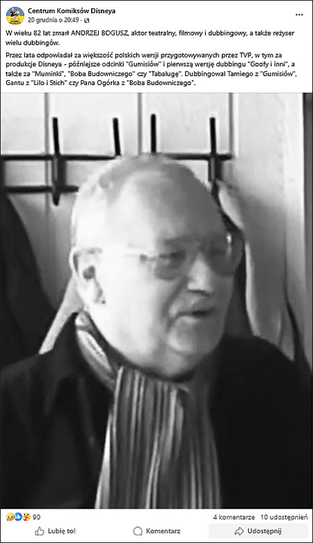 W wieku 82 lat zmarł Andrzej Bogusz. Aktor teatralny, filmowy i dubbingowy oraz jeden z najważniejszych reżyserów dubbingu w historii Telewizji Polskiej. Jego nazwisko rzadko pojawiało się na pierwszym planie, ale to właśnie on przez dekady decydował o brzmieniu kultowych bajek - przypomina Wprost.pl.