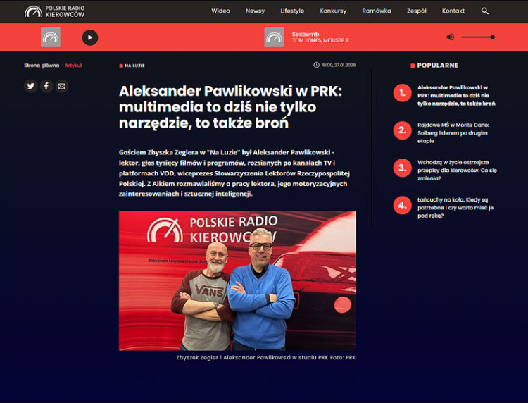 Wiceprezes Stowarzyszenia Lektorów Rzeczypospolitej Polskiej, głos tysięcy filmów i programów rozsianych po kanałach TV i platformach VOD, był gościem Zbyszka Zeglera w "Na Luzie" (Polskie Radio Kierowców).